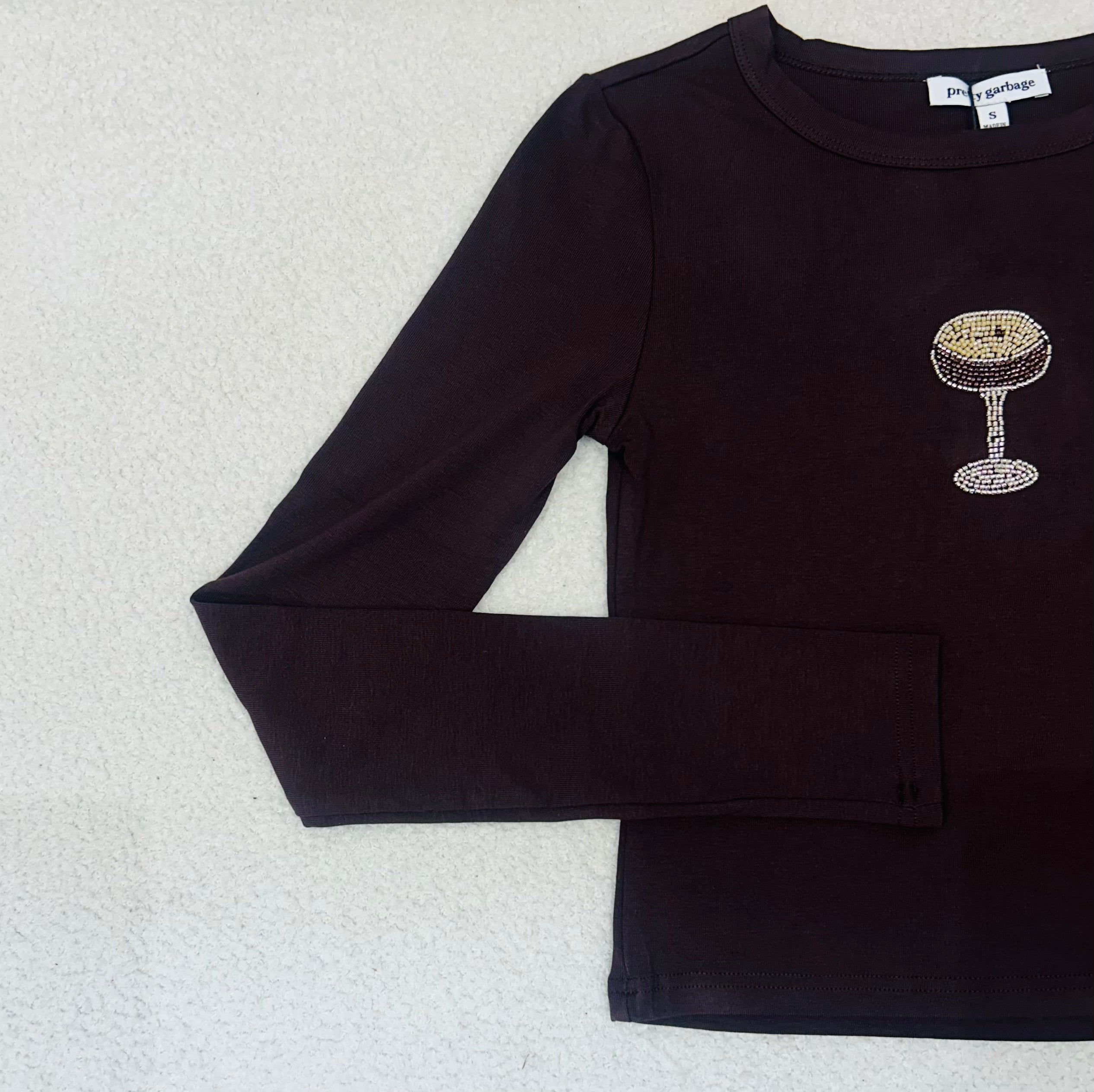 Sip in style with our Espresso Martini Beaded Tee—the upscale basic that doubles as a statement piece. Delicate bead work catches the light with every move, transforming a simple tee into something unexpected. Perfect for those who believe everyday wear deserves a little sparkle and sophistication. Dress it up or keep it casual; this versatile essential works harder than your bartender !